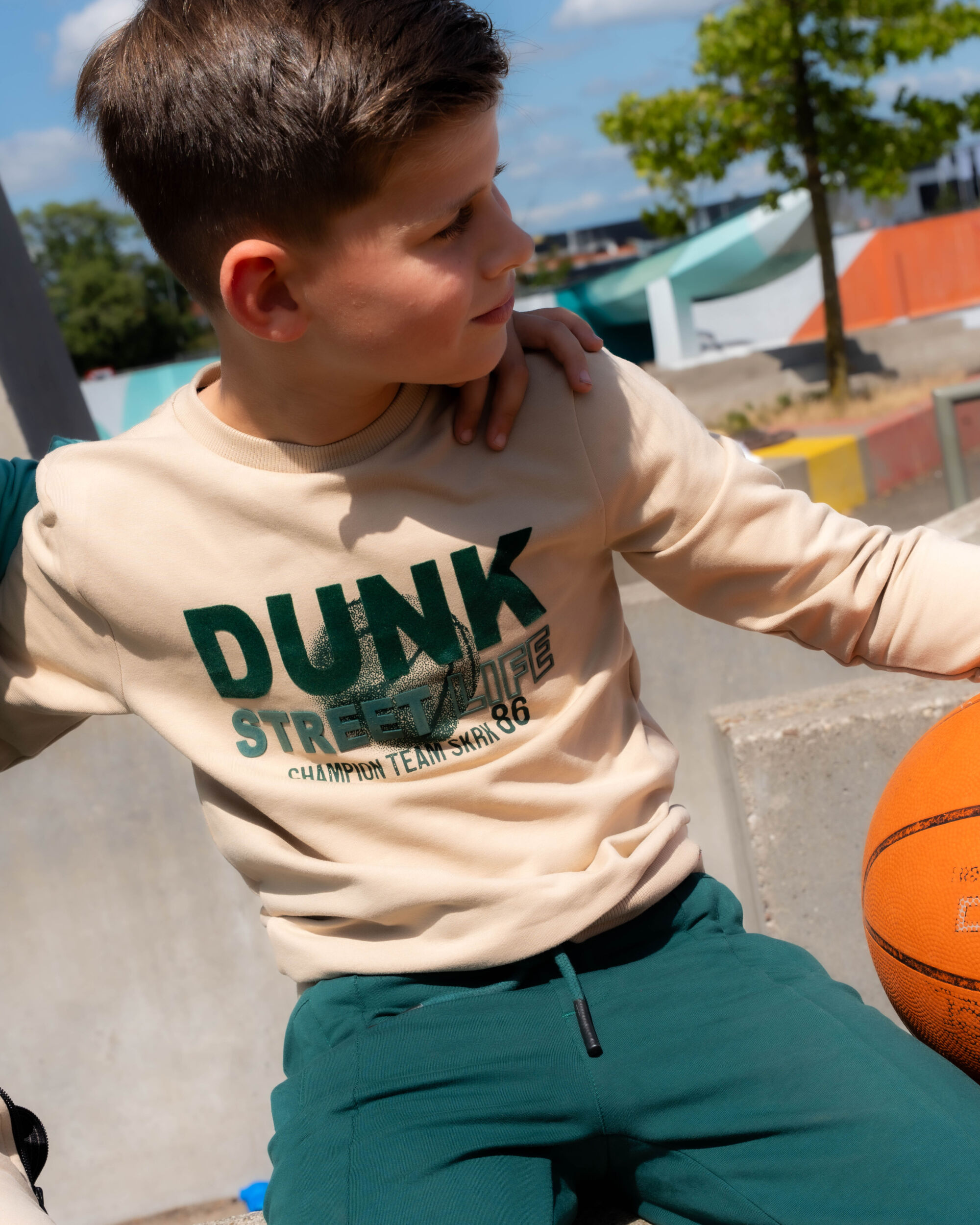 De beige sweater Sted heeft een gave flock print op de voorkant. De sweater is gemaakt van biologisch katoen en elastaan. Sweater verkrijgbaar in maat 92 t/m 164.