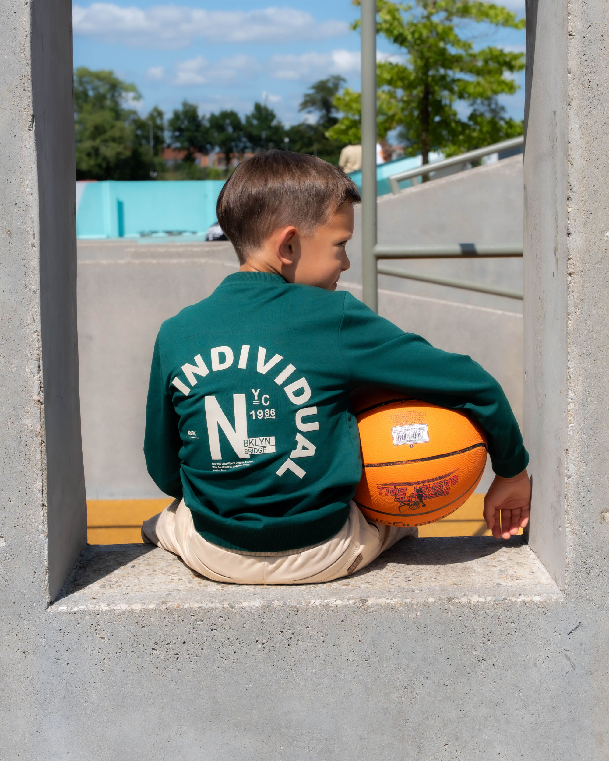 De groene sweater Subbe heeft een kleine print op de voorkant en een gave print op de achterkant. De sweater is gemaakt van biologisch katoen en elastaan. Sweater verkrijgbaar in maat 92 t/m 164.