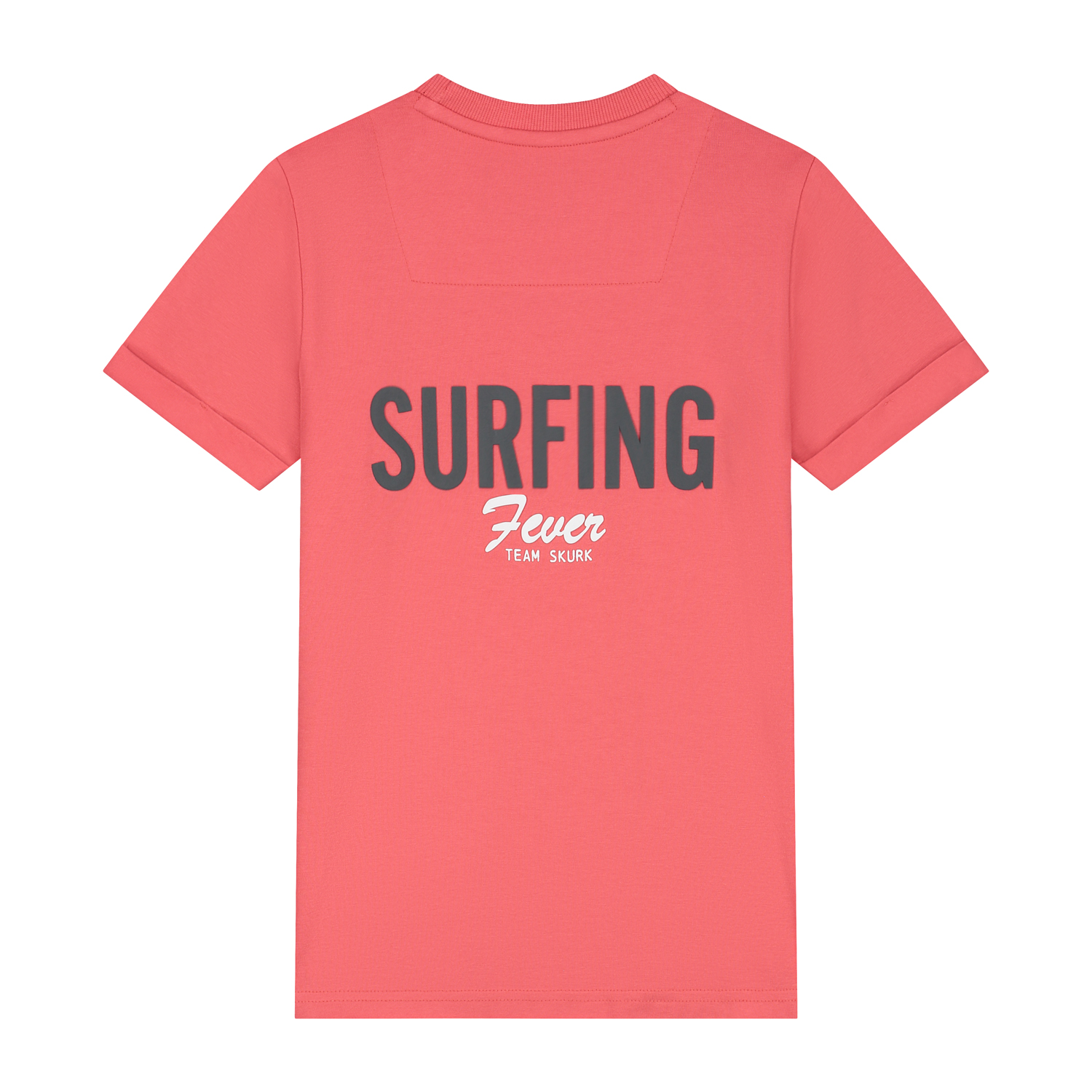 De Tima uit de nieuwe SKURK zomer collectie is een framboos rood jongens t-shirt gemaakt van biologisch katoen en elastaan. Hierdoor krijgt het t-shirt een hoog draagcomfort en ademend vermogen. Op de voorkant heeft het een kleine print en op de achterkant een toffe backprint. SURK t-shirt verkrijgbaar in maat 92 t/m 164.